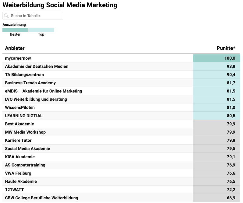 Das Ergebnis dieser Untersuchung ist für uns ein besonderer Anlass zur Freude: Unser Social-Media-Kurs wurde als „Beste Weiterbildung“ ausgezeichnet – mit deutlichem Abstand zur Konkurrenz.