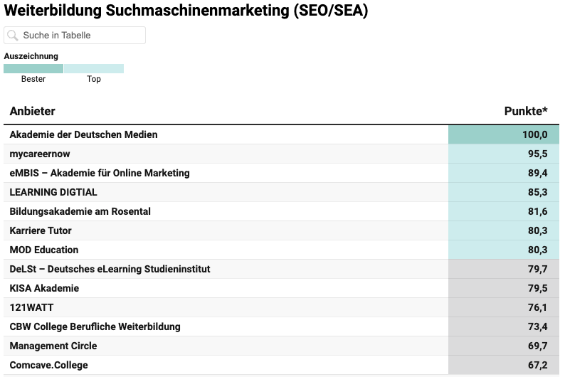 Die Auszeichnung bestätigt, was viele unserer Teilnehmerinnen und Teilnehmer bereits erleben: Erfolgreiche Weiterbildung entsteht dort, wo aktuelles Fachwissen, praxisnahe Anwendung und didaktisch hochwertige Vermittlung zusammenkommen, hier konnten wir uns im Ranking klar an der Spitze positionieren. Besonders hervorheben möchten wir, dass wir uns mit großem Abstand gegenüber anderen Anbietern etabliert haben.